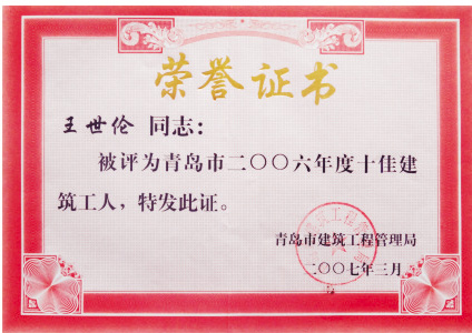 王世倫 青島市2006年度十佳建筑工人
