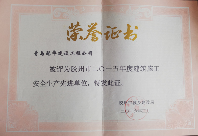 膠州市2015年度建筑施工安全生產(chǎn)先進單位